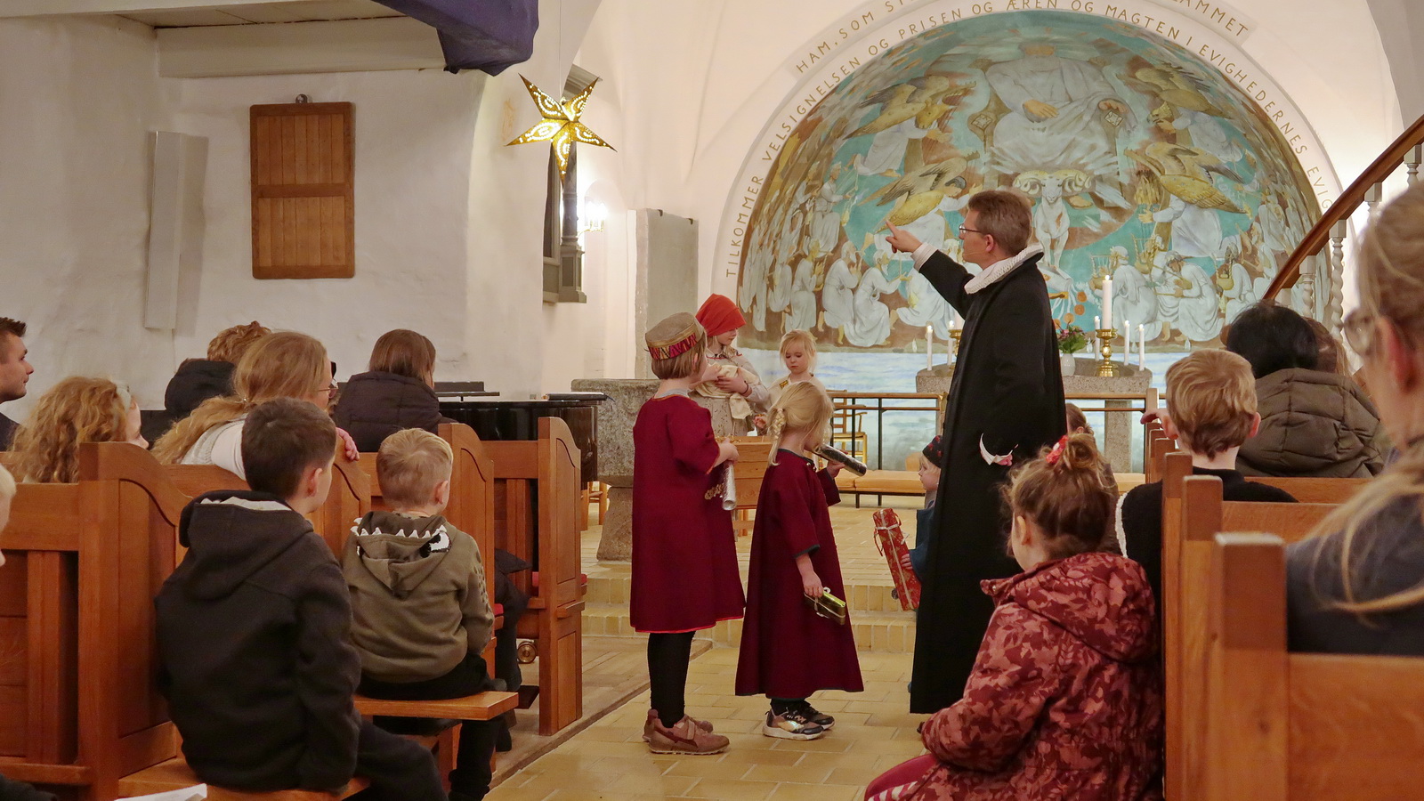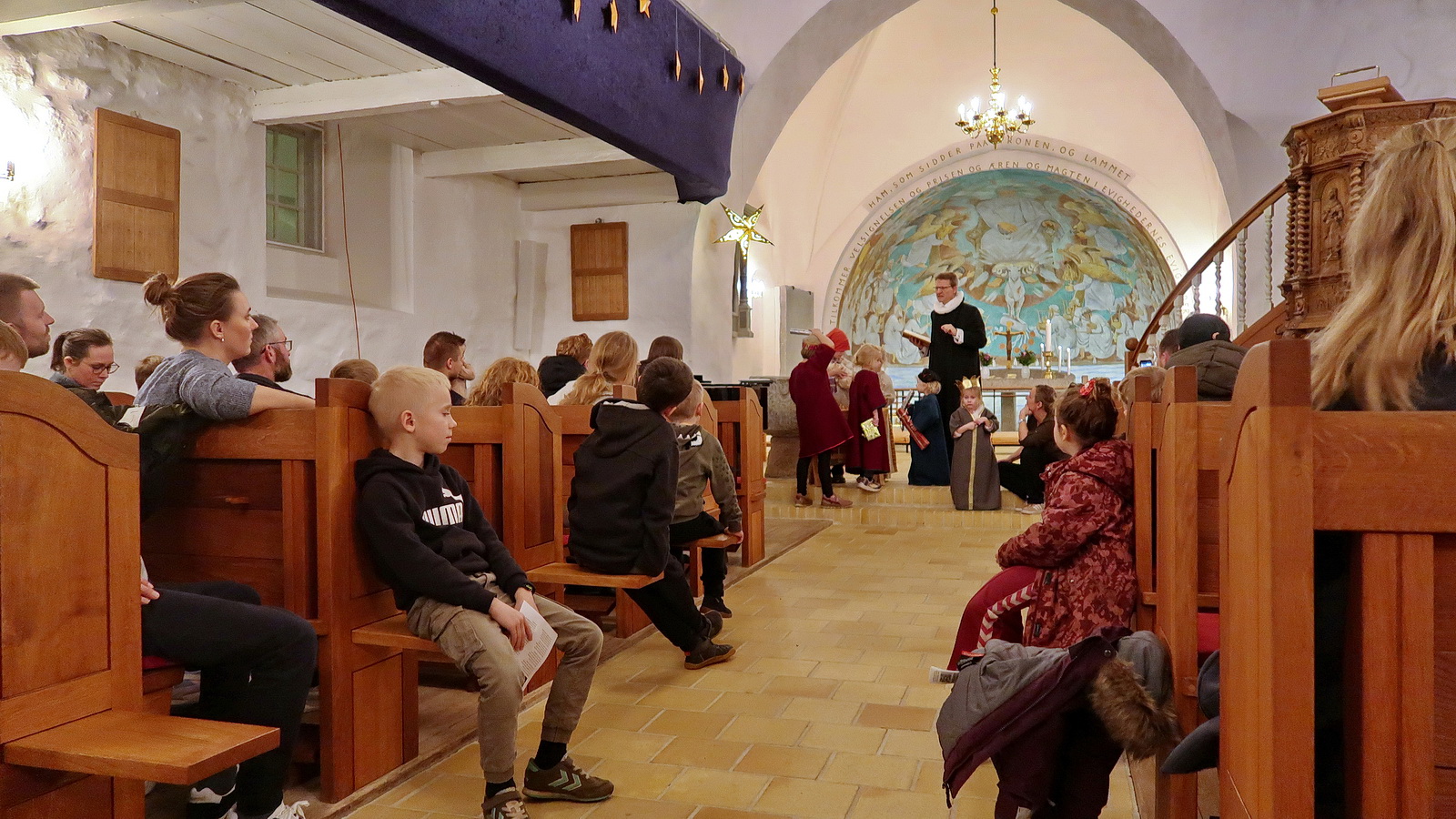 Nytårskuren den 8. januar faldt i år sammen med den spaghettigudstjeneste, der normalt finder sted anden onsdag i måneden. Vi mødtes i kirken sammen med børn og forældre - og vi blev budt velkommen som bedsteforældre! Sognepræst Erik Holmgaard og Kirke- og kulturmedarbejder Vibeke Hansen Vibe stod for gudstjenesten, som handlede om De hellige tre Konger. Fortællingen blev fortalt og dramatiseret, og der blev sunget til.